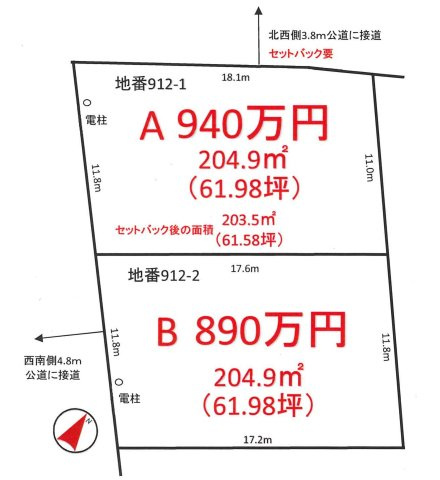 | 価格 | 890万円 ・ 940万円 | 坪単価 | 14.36万円 ~ 15.17万円 |